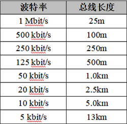 注意:CAN-Bus電纜可以使用普通雙絞線、屏蔽雙絞線。理論最大通信距離主要取決于總線波特率,最大總線長度和波特率關(guān)系詳見下表。若通訊距離超過1Km,應(yīng)保證線的截面積大于Φ1.0mm2,具體規(guī)格應(yīng)根據(jù)距離而定,常規(guī)是隨距離的加長而適當(dāng)加大。