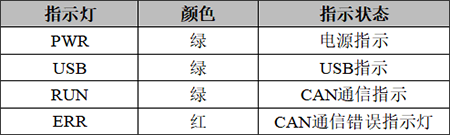 USB接口及電源接口連接,打開供電開關(guān),供電正常后,PWR指示燈會亮;當(dāng)CAN端有數(shù)據(jù)傳輸時相應(yīng)通道的RUN燈會亮;當(dāng)CAN總線產(chǎn)生錯誤時ERR會亮。