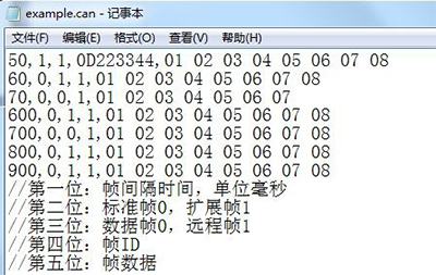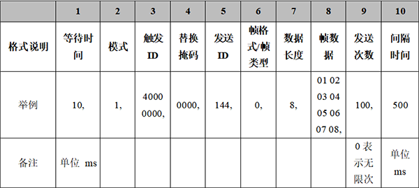 此條數(shù)據(jù)的功能是:上電等待10ms,初始化CAN1通道收發(fā)數(shù)據(jù),不設(shè)置觸發(fā),不替換ID和數(shù)據(jù),發(fā)送ID 144,標(biāo)準(zhǔn)幀,數(shù)據(jù)長度8位,發(fā)送數(shù)據(jù)01 02.....08,發(fā)送次數(shù)100次,每次發(fā)送時間間隔500ms。