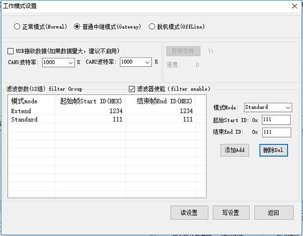 濾波設(shè)置:通過編輯濾波ID的方式,實現(xiàn)多段濾波。