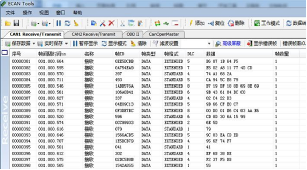 接收和發(fā)送界面是ECANTools的主要功能,在此界面,用戶可以直觀的看到接收到的CAN報文,以及通過普通發(fā)送或列表發(fā)送的方式,向總線上發(fā)送數(shù)據(jù)。