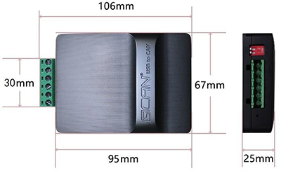 設(shè)備外形尺寸:(長(zhǎng),含接線端子)106mm*(寬)67mm*(高)25mm,其示意圖如圖所示。