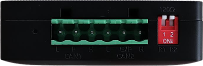 注意:USBCAN-I Pro+內(nèi)部已集成120Ω終端電阻,可通過撥碼開關(guān)選擇是否將電阻接入總線,撥碼開關(guān)在4pin端子旁邊,R1、R2兩個(gè)開關(guān)控制同一個(gè)電阻,請(qǐng)一起對(duì)R1、R2進(jìn)行操作,撥到ON的位置即可將電阻啟用。