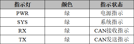 USBCAN-I Pro+接口卡具有1個(gè)PWR指示燈、1個(gè)SYS指示燈、1個(gè)RX指示燈、1個(gè)TX指示燈來指示設(shè)備的運(yùn)行狀態(tài)。這4個(gè)指示燈的具體指示功能見下表,這4個(gè)指示燈處于各種狀態(tài)下時(shí),CAN總線的狀態(tài)如下表所示。