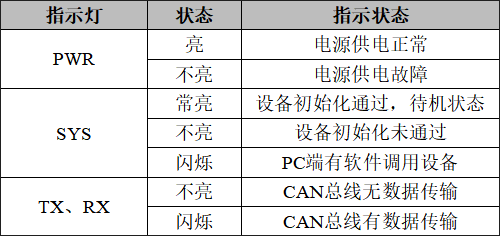 USBCAN-I Pro+接口卡指示燈狀態(tài)