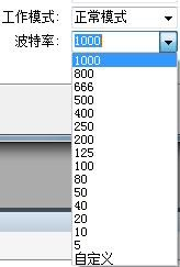 選中設(shè)備后,在下邊可以設(shè)置一些具體的工作模式和波特率。如您購(gòu)買的是雙通道設(shè)備,可通過選項(xiàng)卡分別對(duì)CAN1、CAN2進(jìn)行設(shè)置,設(shè)置波特率尤為重要,此處設(shè)置波特率不可以手動(dòng)輸入,需要通過下拉菜單選擇,我公司產(chǎn)品支持如圖所示標(biāo)準(zhǔn)波特率: