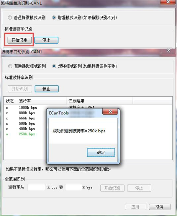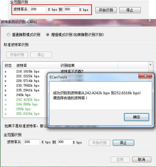波特率自動(dòng)識(shí)別功能按檢索范圍的不同,可分為兩種模式:A.標(biāo)準(zhǔn)波特率識(shí)別(對(duì)標(biāo)準(zhǔn)的CAN波特率進(jìn)行一一識(shí)別),B.全范圍波特率識(shí)別(手動(dòng)輸入識(shí)別范圍,軟件將對(duì)范圍內(nèi)的波特率進(jìn)行全面匹配)。例如,某CAN總線系統(tǒng)的波特率未知,使用標(biāo)準(zhǔn)波特率識(shí)別顯示“沒有找到合適的波特率”時(shí),您可在“全范圍識(shí)別”區(qū)域設(shè)置波特率從5kbps識(shí)別到1000kbps,即可識(shí)別到所需的波特率。