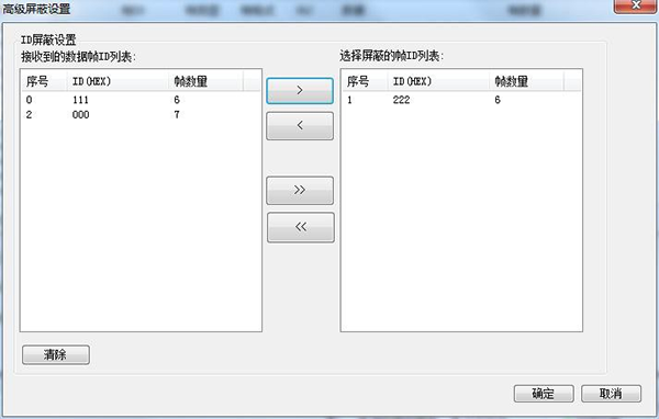 GCANTools軟件可以屏蔽接收到的指定的CAN幀數(shù)據(jù)。GCANTools軟件可以將接收到的數(shù)據(jù)按幀ID歸類后合并顯示在左側(cè)的待屏蔽列表中,從左邊的列表中您可以選擇需要屏蔽的幀ID,點(diǎn)擊向右箭頭即可將選中的幀ID添加到屏蔽列表中,軟件將自動(dòng)屏蔽右側(cè)列表中所有以此幀ID開頭的所有數(shù)據(jù),屏蔽列表可以設(shè)置多條屏蔽幀ID。