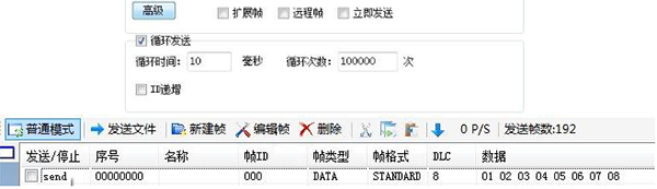 右側(cè)上方DBC消息發(fā)送列表:顯示用于發(fā)送的消息列表,可雙擊編輯發(fā)送次數(shù)、發(fā)送間隔;