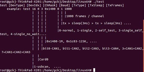 7.運(yùn)行測(cè)試程序測(cè)試USBCAN收發(fā)。輸入:./test