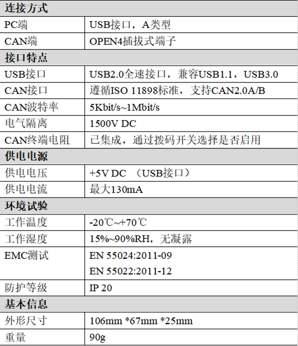 (1)PC接口符合USB2.0全速規(guī)范,兼容USB1.1及USB3.0;(2)集成1路CAN-bus接口,使用插拔式端子接線方式;(3)支持CAN2.0A和CAN2.0B幀格式,符合ISO/DIS 11898規(guī)范;(4)CAN-bus通訊波特率在5Kbps~1Mbps之間任意可編程;(5)使用USB總線電源供電(DC+5V,130mA);(6)CAN-bus接口采用電氣隔離,隔離模塊絕緣電壓:DC 1500V;(7)最高接收數(shù)據(jù)流量:14000 fps;(8)CAN端接收?qǐng)?bào)文時(shí)間戳精度可達(dá)1us;(9)支持WinXP、Win7、Win8、Win10等Windows操作系統(tǒng);(10)支持Linux操作系統(tǒng);(11)支持ECANTools測(cè)試軟件;(12)工作溫度范圍:-20℃~+70℃;