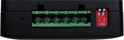 注意:USBCAN-II C+內部已集成120Ω終端電阻,可通過撥碼開關選擇是否將電阻接入總線,撥碼開關在6pin端子旁邊,R1、R2分別為CAN1、CAN2的終端電阻,撥到ON的位置即可將電阻啟用。