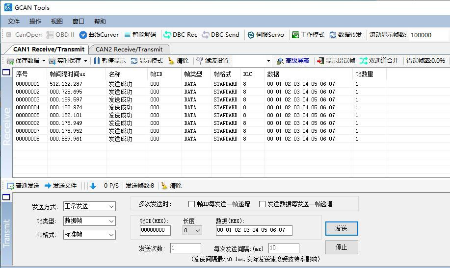 接收和發(fā)送界面是GCANTools的主要功能,在此界面,用戶可以直觀的看到接收到的CAN報文,以及通過普通發(fā)送或列表發(fā)送的方式,向總線上發(fā)送數(shù)據(jù)。