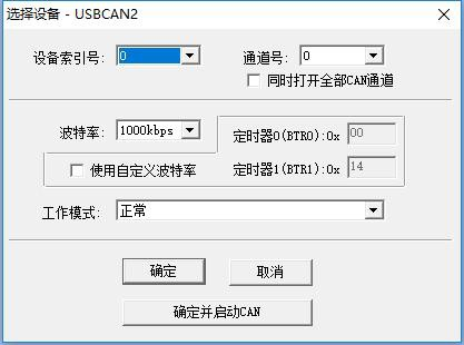 3、選擇設備索引號及第幾路CAN。當用戶在同一臺電腦上插入多個同型號的USBCAN時,需要選擇對應的索引號來區(qū)分打開哪個設備。選擇第幾路CAN則是選擇打開設備的CAN1或CAN2,如想同時打開,則需勾選“選擇所有CAN”。