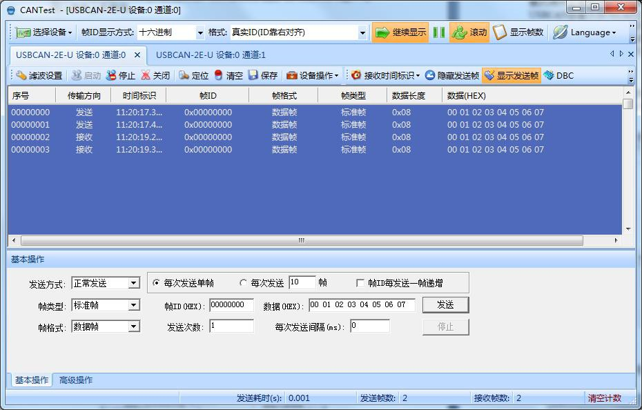 接收和發(fā)送CAN總線數(shù)據(jù)是CAN Test的主要功能,在軟件主界面,用戶可以直觀的看到接收到的CAN報文,以及通過基本操作或高級操作向總線上發(fā)送數(shù)據(jù)。