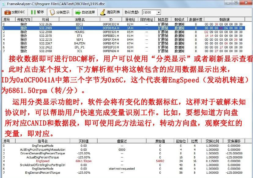 CAN Test軟件的核心功能——DBC文件解析??梢酝ㄟ^加載DBC文件的方式對接收到的總線數(shù)據(jù)進行詳細解析,軟件自帶CANopen協(xié)議、J1939協(xié)議和BMS協(xié)議解析的DBC文件,用戶可以通過加載這些文件的方式,將符合對應協(xié)議標準的數(shù)據(jù)的詳細意義解析出來。此功能特別適合做汽車電子的用戶使用,使用J1939協(xié)議DBC解析可以將符合J1939協(xié)議的汽車數(shù)據(jù)解析出具體意義,如車速、轉速等具體信息。