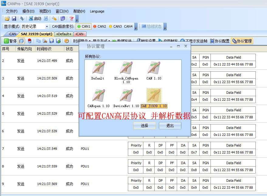 CAN Pro軟件除基本收發(fā)功能與CAN Test軟件類似外,其核心功能在于——CAN高層協(xié)議解析。CAN Pro軟件的協(xié)議解析功能支持3種CAN總線高層協(xié)議:CANopen、SAEJ1939、Devicenet。