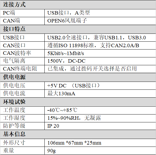 (1)PC接口符合USB2.0全速規(guī)范,兼容USB1.1及USB3.0;(2)集成2路CAN-bus接口,使用鳳凰端子接線方式;(3)支持CAN2.0A和CAN2.0B幀格式,符合ISO/DIS 11898規(guī)范;(4)CAN-bus通訊波特率在5Kbps~1Mbps之間任意可編程;(5)使用USB總線電源供電,或供電不足時增加外接電源(DC+9-24V,130mA);(6)CAN-bus接口采用電氣隔離,隔離模塊絕緣電壓:DC 1500V;(7)CAN接口EMC等級:靜電放電接觸放電±6KV,電快速瞬變脈沖群±1KV,浪涌(沖擊)±2KV。(8)最高接收數(shù)據(jù)流量:8000 fps;(9)支持Win2000、WinXP、Win7、Win8、Win10等Windows操作系統(tǒng);(10)支持GCANTools、CAN Test、CAN Pro測試軟件;(11)工作溫度范圍:-40℃~+85℃;