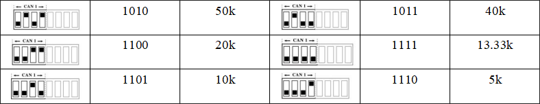 撥碼開關(guān)設(shè)置波特率方法:系統(tǒng)先不要上電,用螺絲刀打開設(shè)備外殼,找到設(shè)備中如上圖所示的撥碼開關(guān),撥碼開關(guān)的“1、2、3、4”號可以對CAN1波特率進行配置,“5、6、7、8”號可以對CAN2波特率進行配置。(只有一路CAN的設(shè)備只有前四個撥碼開關(guān)有效)具體配置方法以CAN1為例,詳見下表。ON方向為0,數(shù)字方向為1。