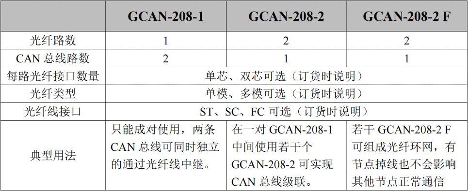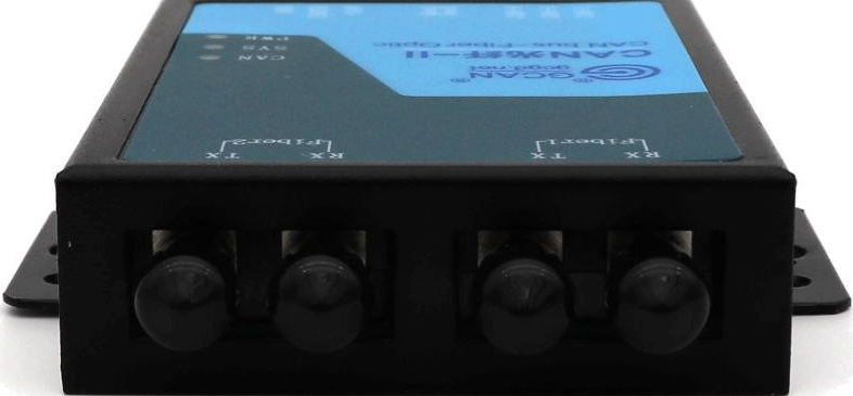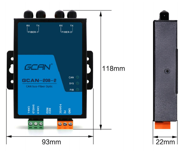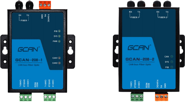 GCAN-208-1模塊集成一路DC 9-24V電源接口、2路標準CAN總線接口及1路標準光纖接口(單模、多模,SC、ST,單芯、雙芯可選)。