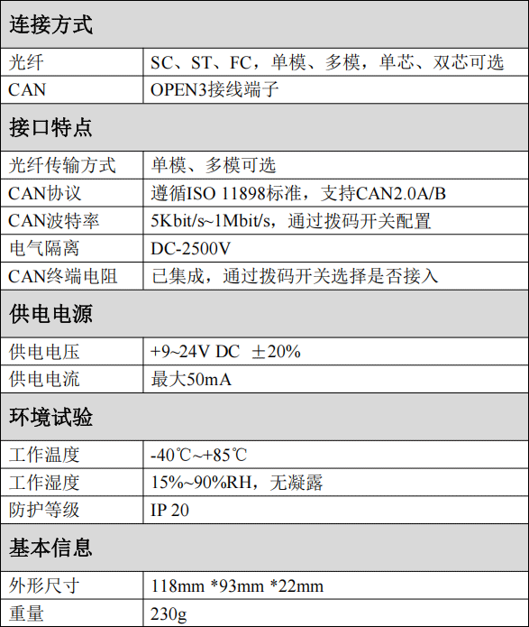 沈陽廣成科技有限公司GCAN-208型CAN轉(zhuǎn)光纖模塊的設(shè)備參數(shù)包括: