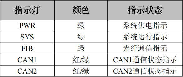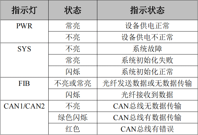 GCAN-208系列模塊具有1個PWR指示燈用來指示系統(tǒng)供電情況,1個SYS指示燈用來指示設(shè)備的運行狀態(tài),1個FIB指示燈,用來指示光纖數(shù)據(jù)傳輸,2個(或1個)CAN指示燈用來指示CAN總線數(shù)據(jù)傳輸。這5個指示燈的具體指示功能見表,這5個指示燈處于各種狀態(tài)的含義如表所示。