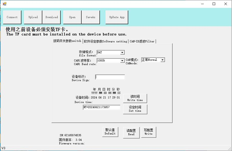 請(qǐng)注意:.DAT格式文件建議保存成每分鐘一個(gè)文件,避免造成數(shù)據(jù)損壞丟失;勾選“使用軟件設(shè)定參數(shù)”之后以軟件配置為準(zhǔn),設(shè)備硬件撥碼撥到數(shù)字一側(cè)。