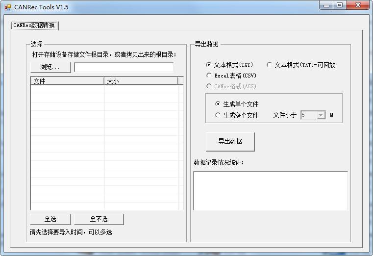 1.打開(kāi)光盤(pán)中的CANRecToolsV1.5軟件,軟件界面如圖所示。2.點(diǎn)擊軟件上方的“瀏覽”按鈕選擇想合并的文件所在的文件夾點(diǎn)擊確定,此時(shí)該文件夾中的所有文件被加載到軟件中。3.選擇想要合并轉(zhuǎn)化的文件并選擇導(dǎo)出數(shù)據(jù)的類型(不要選中只有時(shí)間戳沒(méi)有數(shù)據(jù)的文件)。4.點(diǎn)擊導(dǎo)出數(shù)據(jù),選擇保存數(shù)據(jù)的位置以及設(shè)置文件名稱之后點(diǎn)擊保存開(kāi)始轉(zhuǎn)換。5.等待進(jìn)度條運(yùn)行完成,點(diǎn)擊確定即可。