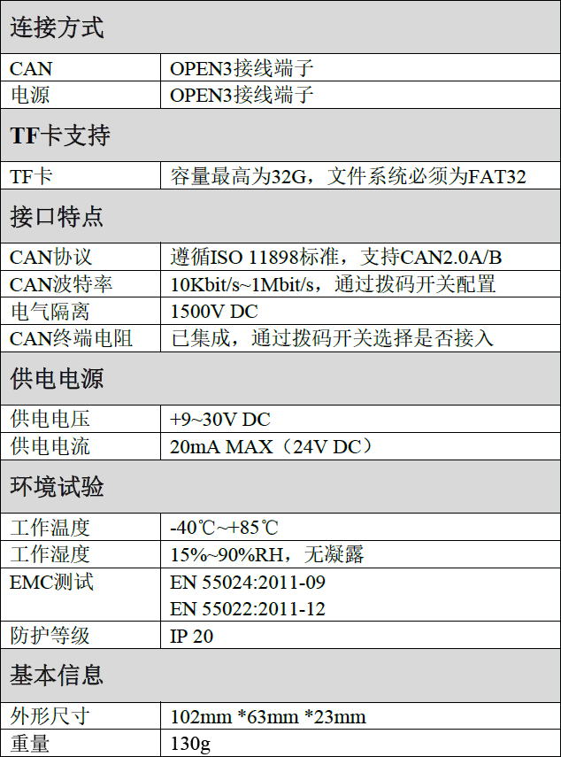 (1)高速的32位工業(yè)級(jí)處理器;(2)使用外接電源供電(DC+9~30V);(3)供電電流:20mA,24V DC;(4)靜電放電抗擾度等級(jí):接觸放電±2KV,空氣放電±15KV;(5)電快速瞬變脈沖群抗擾度等級(jí):±1KV;(6)浪涌抗擾度等級(jí):±1KV;(7)集成1路標(biāo)準(zhǔn)CAN總線接口,使用OPEN3接線端子;(8)CAN總線支持CAN2.0A、CAN2.0B幀格式,符合ISO/DIS 11898標(biāo)準(zhǔn);(9)CAN總線通訊波特率在10Kbps~1Mbps之間可通過(guò)撥碼開(kāi)關(guān)配置;(10)CAN總線接口采用電氣隔離,隔離模塊絕緣電壓:DC 2500V;(11)最高接收數(shù)據(jù)流量:2000 fps/秒;(12)CAN數(shù)據(jù)帶有時(shí)間戳,精度0.1ms;(13)工作溫度范圍:-40℃~+85℃;(14)工作濕度范圍:5%~95%RH無(wú)凝露;