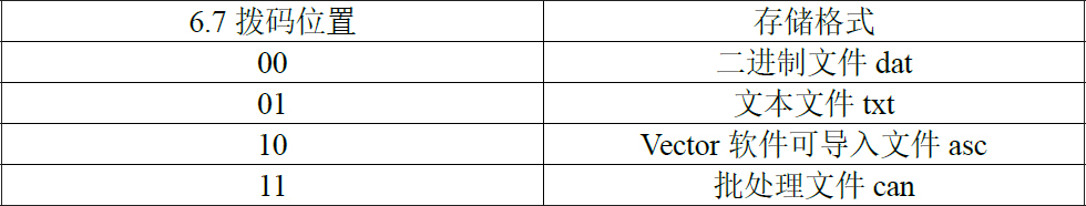 CAN總線數(shù)據(jù)存儲(chǔ)器支持四種保存數(shù)據(jù)格式:二進(jìn)制文件(.DAT)、文本文件(.TXT)、Vector軟件可導(dǎo)入文件(.ASC)、批處理文件(.CAN)可通過(guò)8位撥碼開(kāi)關(guān)中的第六和七個(gè)開(kāi)關(guān)切換,如圖所示。