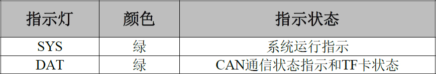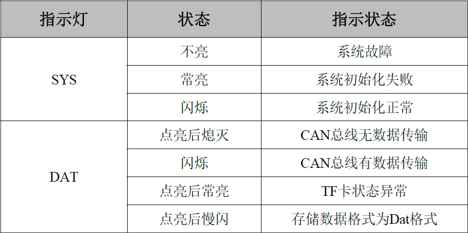 CAN總線數(shù)據(jù)存儲(chǔ)器具有1個(gè)SYS指示燈用來(lái)指示系統(tǒng)運(yùn)行狀態(tài),1個(gè)DAT指示燈用來(lái)指示CAN總線數(shù)據(jù)傳輸和TF卡狀態(tài)。這2個(gè)指示燈的具體指示功能見(jiàn)表,這2個(gè)指示燈處于各種狀態(tài)的含義如表所示。