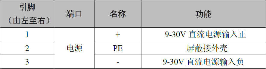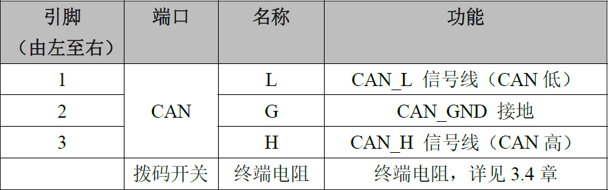 GCAN-401模塊CAN-bus接口由1個(gè)3Pin插拔式接線端子(綠色)引出,可以用于連接1個(gè)CAN-bus網(wǎng)絡(luò)或者CAN-bus接口的設(shè)備。其電源接口定義如表所示。