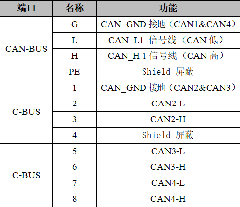 GCAN-GT-414模塊CAN-bus接口由3個4 Pin接線端子引出,可以用于連接4個CAN-bus網(wǎng)絡或者CAN-bus接口的設備,其接口定義如下表所示。