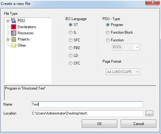 為項目添加文件(例如:添加ST語言編寫的程序頁ST,Program),如圖所示。請注意,Name(名稱)一欄中填入的字符串不能以數(shù)字為開頭。