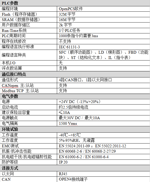 (1)高速的32位工業(yè)級處理器;(2)內(nèi)嵌硬件看門狗定時器;(3)使用外接電源供電(DC+24V,100mA);(4)靜電放電抗擾度等級:接觸放電±2KV,空氣放電±8KV;(5)電快速瞬變脈沖群抗擾度等級:±1KV;(6)浪涌抗擾度等級:±1KV;(7)工作濕度范圍:5%~95%RH無凝露;(8)4路CAN總線接口,1路以太網(wǎng)接口;(9)編程軟件:OpenPCS(符合IEC 61131-3標準);(10)支持CANopen協(xié)議主/從站功能;(11)支持Modbus TCP主/從站功能;(12)標準DIN導軌安裝方式,專為工業(yè)設計。(13)電氣隔離為1500 Vrms;(14)工作溫度范圍:-40℃~+85℃;(15)防護等級:IP20。