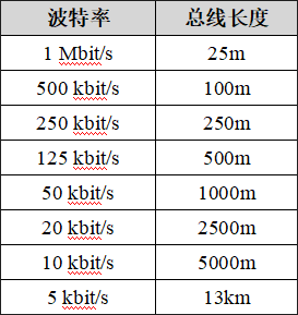 請(qǐng)注意:CAN-bus電纜可以使用普通雙絞線、屏蔽雙絞線。理論最大通信距離主要取決于總線波特率,最大總線長(zhǎng)度和波特率關(guān)系詳見下表。若通訊距離超過1km,應(yīng)保證線的截面積大于Φ1.0mm2,具體規(guī)格應(yīng)根據(jù)距離而定,常規(guī)是隨距離的加長(zhǎng)而適當(dāng)加大。