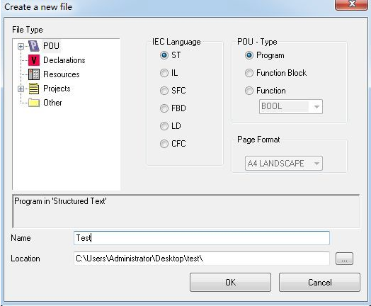 為項(xiàng)目添加文件(例如:添加ST語言編寫的程序頁ST,Program),如圖所示。請(qǐng)注意,Name(名稱)一欄中填入的字符串不能以數(shù)字為開頭。