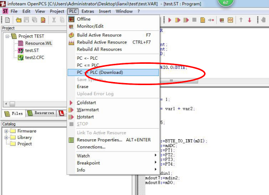 (6)在下拉菜單中點(diǎn)擊PC->PLC(Download)下載程序。