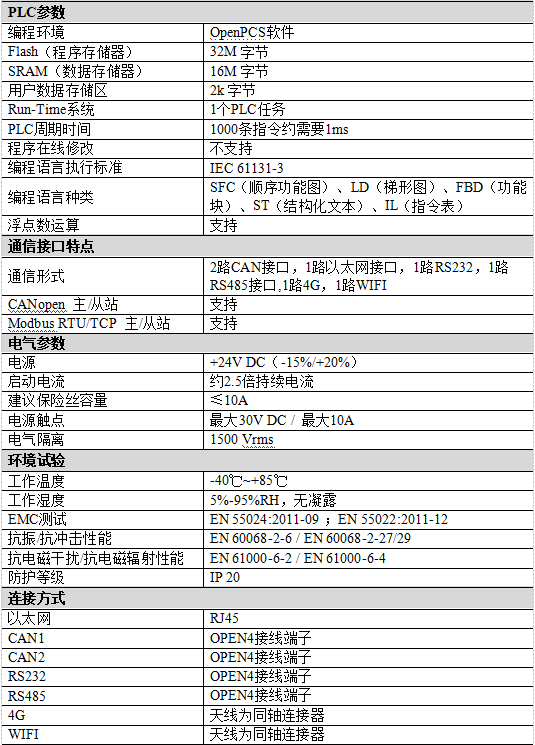 (1)高速的32位工業(yè)級(jí)處理器;(2)內(nèi)嵌硬件看門狗定時(shí)器;(3)使用外接電源供電(DC+24V,100mA);(4)靜電放電抗擾度等級(jí):接觸放電±2KV,空氣放電±8KV;(5)電快速瞬變脈沖群抗擾度等級(jí):±1KV;(6)浪涌抗擾度等級(jí):±1KV;(7)工作濕度范圍:5%~95%RH無凝露;(8)2路CAN總線接口、1路以太網(wǎng)總線接口、1路RS485總線接口、1路RS232總線接口,1路4G接口、1路WIFI接口。(9)編程軟件:OpenPCS(符合IEC 61131-3標(biāo)準(zhǔn));(10)支持CANopen協(xié)議主/從站功能;(11)支持Modbus TCP主/從站功能;(12)標(biāo)準(zhǔn)DIN導(dǎo)軌安裝方式,專為工業(yè)設(shè)計(jì)。(13)電氣隔離為1500 Vrms;(14)工作溫度范圍:-40℃~+85℃;(15)防護(hù)等級(jí):IP20。