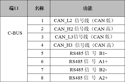 GCAN-GT-419模塊C-bus接口由2個4 Pin接線端子引出,有2個獨(dú)立的CAN接口,和2個獨(dú)立的485接口。其接口定義如表所示。