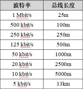 波特率與最大總線長度參照表