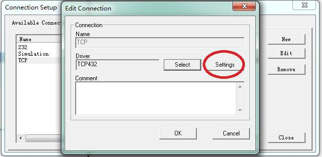 5、Driver中會顯示“TCP432”字樣,點(diǎn)擊“Settings(設(shè)置)”按鈕。