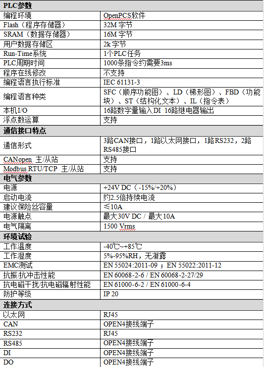 (1)高速的32位工業(yè)級處理器;(2)內(nèi)嵌硬件看門狗定時器;(3)使用外接電源供電(DC+24V,100mA);(4)靜電放電抗擾度等級:接觸放電±2KV,空氣放電±8KV;(5)電快速瞬變脈沖群抗擾度等級:±1KV;(6)浪涌抗擾度等級:±1KV;(7)工作濕度范圍:5%~95%RH無凝露;(8)3路CAN總線接口,1路以太網(wǎng)接口,1路RS232串行接口、2路RS485串行接口;(9)編程軟件:OpenPCS(符合IEC 61131-3標(biāo)準(zhǔn));(10)支持CANopen協(xié)議主/從站功能;(11)支持Modbus TCP主/從站功能;(12)標(biāo)準(zhǔn)DIN導(dǎo)軌安裝方式,專為工業(yè)設(shè)計。(13)電氣隔離為1500 Vrms;(14)工作溫度范圍:-40℃~+85℃;(15)防護(hù)等級:IP20。