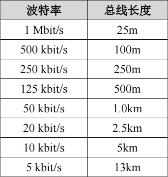 波特率與最大總線長度參照表