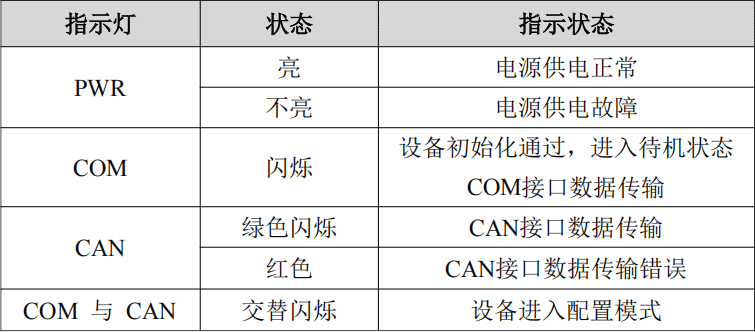GCAN-207模塊具有1個PWR指示燈、1個COM指示燈、1個CAN指示燈來指示設(shè)備的運行狀態(tài)。這3個指示燈的具體指示功能及狀態(tài)如表所示。