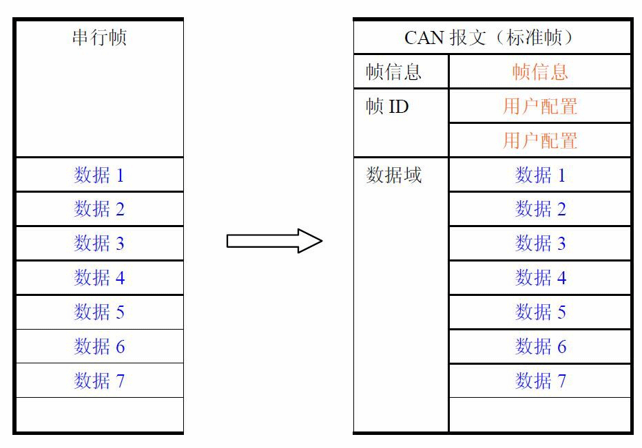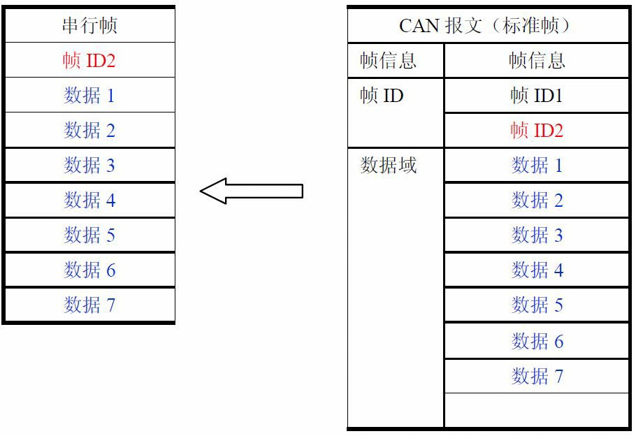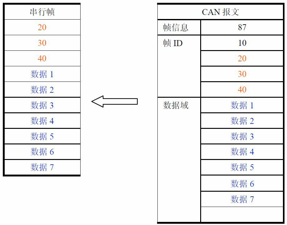透明帶標(biāo)識轉(zhuǎn)換是透明轉(zhuǎn)換的一種特殊的用法,也不附加協(xié)議。這種轉(zhuǎn)換方式是根據(jù)通常的串行幀和CAN報文的共有特性,使這兩種不同的總線類型也能輕松的組建同一個通信網(wǎng)絡(luò)。