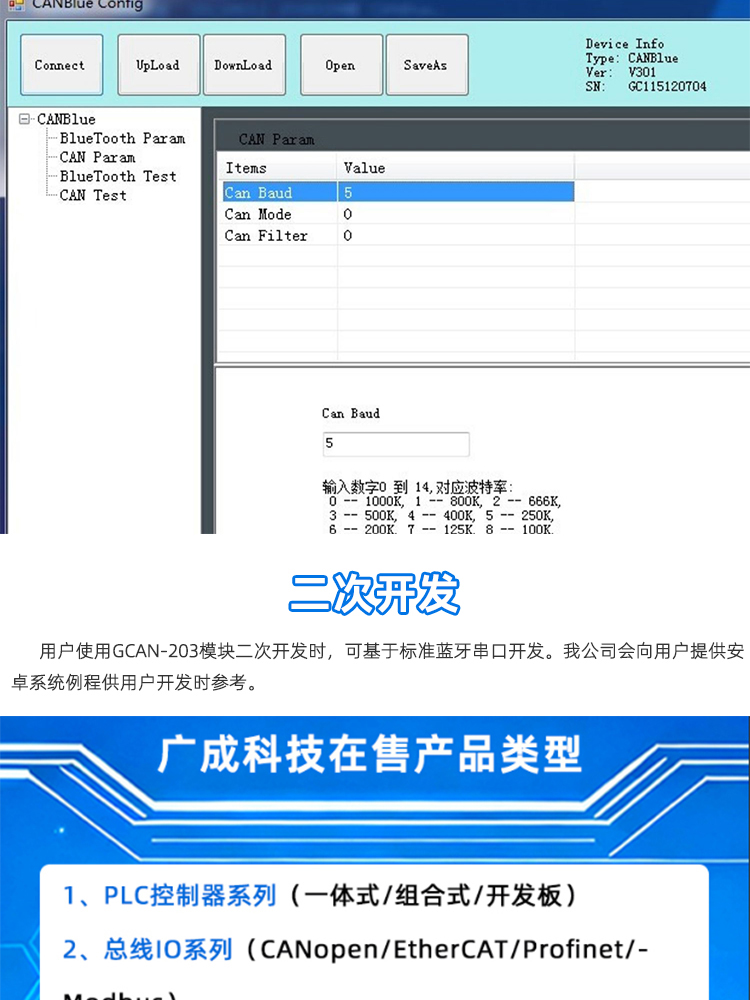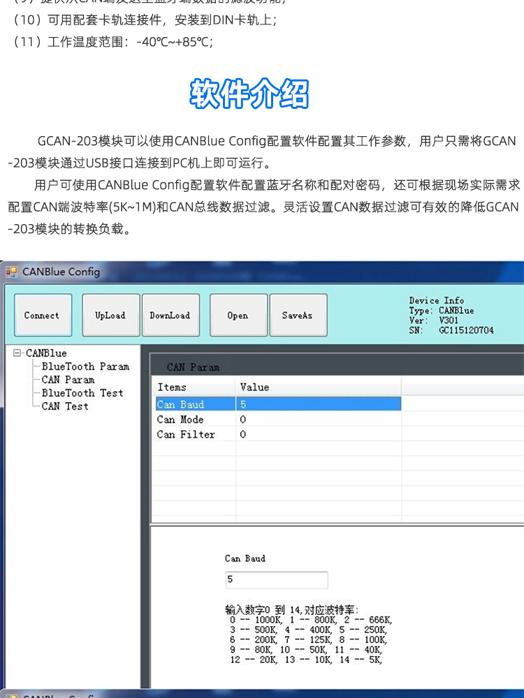 (1)CAN總線支持CAN2.0A和CAN2.0B幀格式,符合ISO/DIS 11898規(guī)范;(2)CAN總線通訊波特率在5kbps~1Mbps之間任意可編程;(3)CAN總線接口采用電氣隔離,隔離模塊絕緣電壓:DC 1500V;(4)最高數(shù)據(jù)流量:300幀/秒;(5)藍(lán)牙使用2.0;(6)使用9~30V DC供電;(7)供電電流:30mA 24V DC;(8)使用CANBlue Config配置工作模式及參數(shù);(9)提供從CAN端發(fā)送至藍(lán)牙端數(shù)據(jù)的濾波功能;(10)可用配套卡軌連接件,安裝到DIN卡軌上;(11)工作溫度范圍:-40℃~+85℃; - 1、GCAN-204 modbus RTU轉(zhuǎn)CAN設(shè)備使用