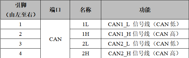 GCAN-402模塊電源接口定義GCAN-402模塊CAN-bus接口由1個(gè)4Pin插拔式接線端子(綠色)引出,可以用于連接2個(gè)CAN-bus網(wǎng)絡(luò)或者CAN-bus接口的設(shè)備。其CAN-bus接口定義如表所示。