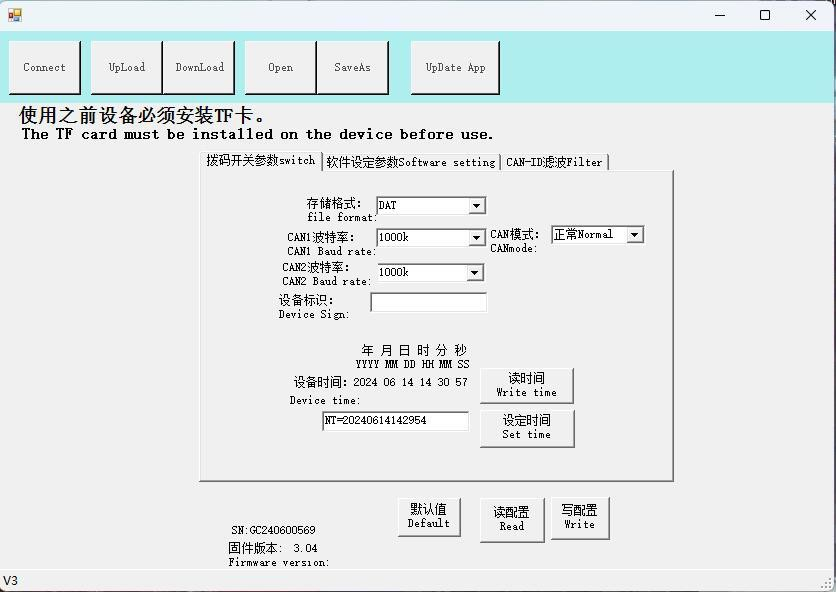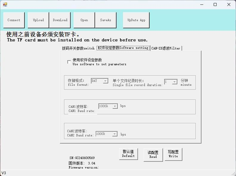請(qǐng)注意:.DAT格式文件建議保存成每分鐘一個(gè)文件,避免造成數(shù)據(jù)損壞丟失;勾選“使用軟件設(shè)定參數(shù)”之后以軟件配置為準(zhǔn),設(shè)備硬件撥碼撥到數(shù)字一側(cè)。