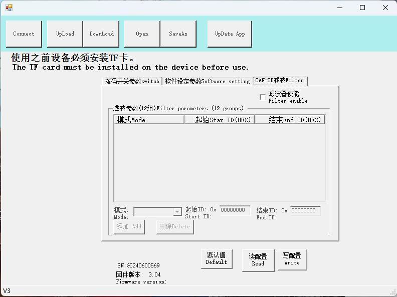 CAN-ID濾波界面如圖所示,如需啟用濾波,則需先勾選“濾波器使能”,之后對(duì)濾波參數(shù)進(jìn)行設(shè)置。首先選擇模式:擴(kuò)展幀濾波或標(biāo)準(zhǔn)幀濾波,選擇好后設(shè)置起始ID和結(jié)束ID,在這兩個(gè)ID之間的幀ID均可正常保存,設(shè)置完成后點(diǎn)擊添加,即可將其添加在濾波列表中,若不需要某條濾波參數(shù),選中后點(diǎn)擊刪除即可。濾波參數(shù)設(shè)置完成后需確認(rèn)“濾波器使能”處于被勾選狀態(tài)才能使濾波生效,否則不開啟濾波功能。